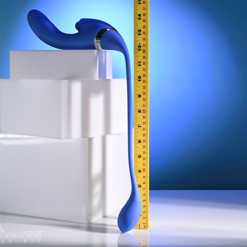 Go all in for pleasure! This unique toy features a gently curved, flexible, thrusting main shaft and a tapping stimulator that's designed to thumpity-thump in multi-speeds right where you want it most. Finally, a long flexible tail finishes with a plump, ergonomic vibrating plug to complete the rapturous experience. All 3 motors are controlled independently with their own buttons at the chunky centre base that offers a relaxed grip.